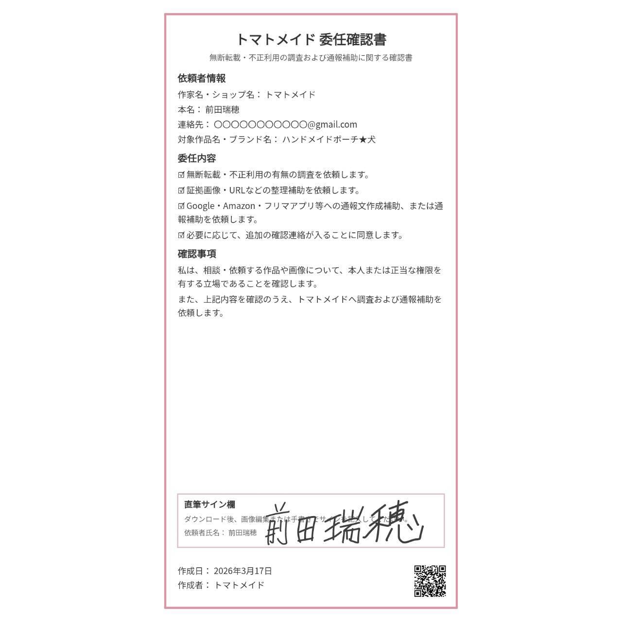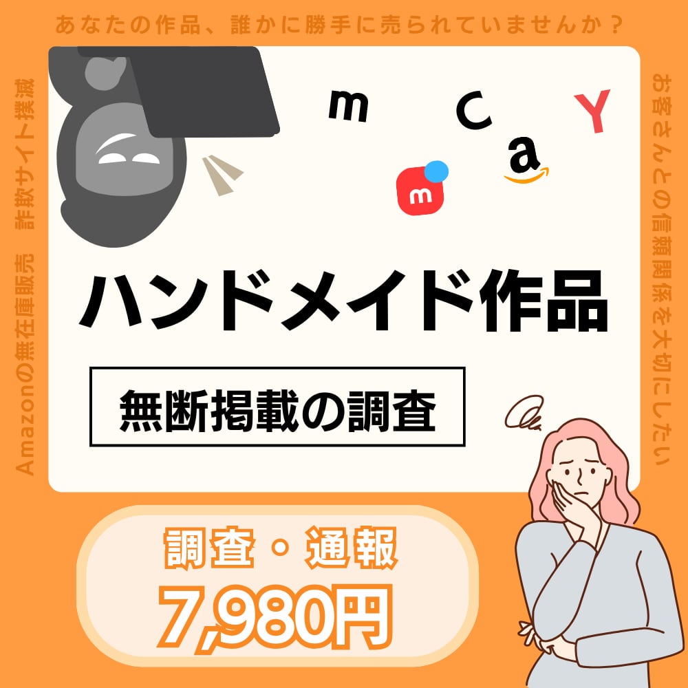 ハンドメイド作品が Amazon・フリマサイト・偽サイト・SNSなどで無断販売されていないかを調査し、必要に応じて 、通報サポートまで行うサービスです。